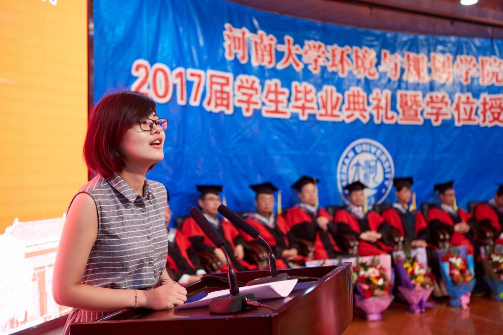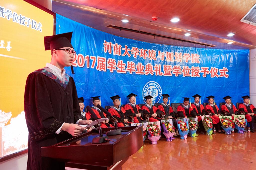 毕业生代表孙伟国向学校、老师送上深深地祝福,感谢老师们的四年栽培,谨记谆谆教导,成为河大精神财富和优良传统的继承者与传递者。2013级王芳代表在校生为学长学姐送上祝福。教师代表孔云峰结合丰富的阅历为学生上大学的最后一课。他说做人要有理想、有目标,敢想敢干,叮嘱2017届毕业生在以后的工作中要“有理想,树信心,抓机遇”,愿他们在新的道路上一帆风顺、前程似锦。