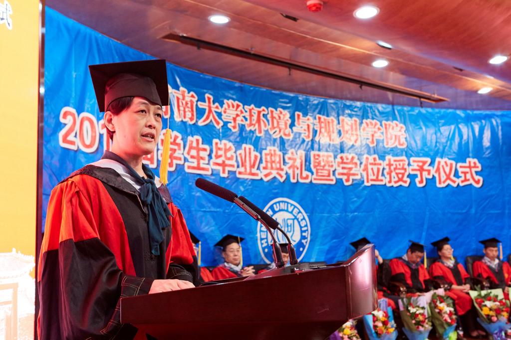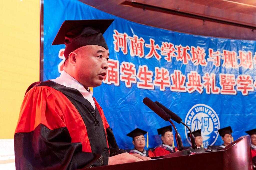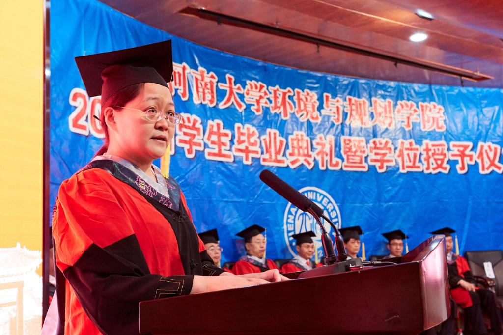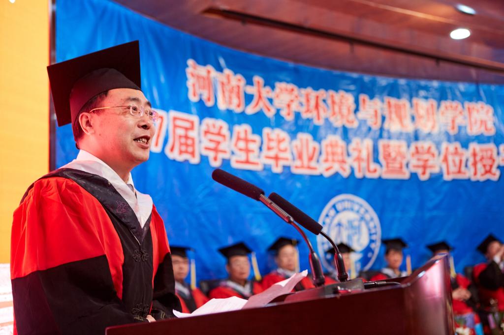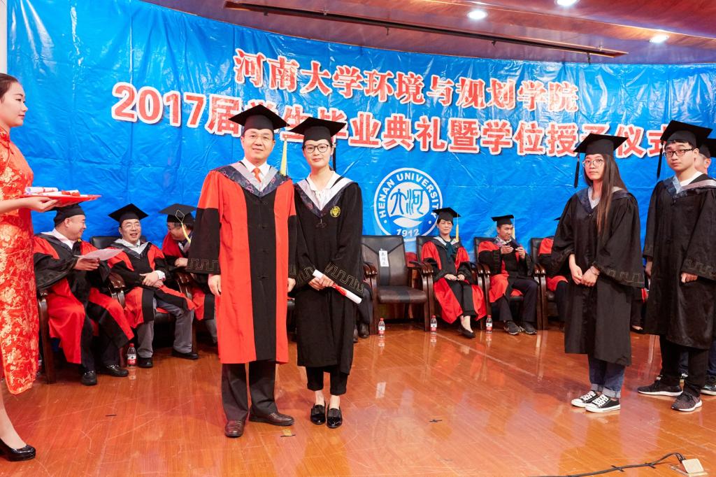 在雄壮的国歌声后,学院副院长翟秋敏为大家宣读了《河南大学关于授予2017届普通本科毕业生学士学位的决定》。院长秦耀辰为300余名毕业生正冠拨苏,颁发学位证书,并一一合影留念。